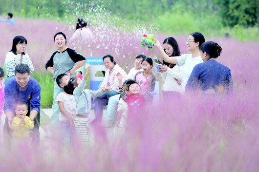 9月21日,市民和游人在市区赓续公园粉黛乱子草粉色“花海”中打卡赏景,乐享秋景。